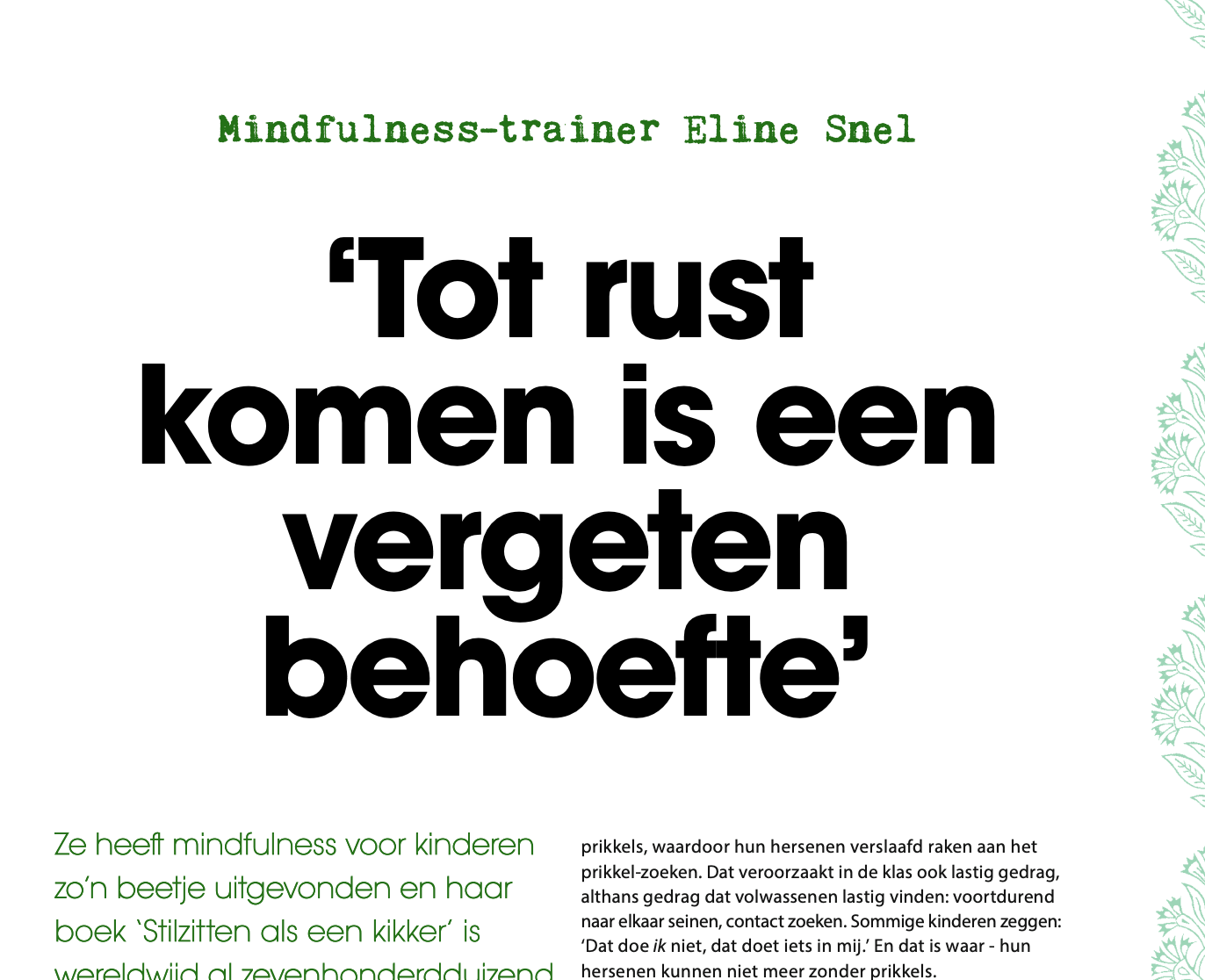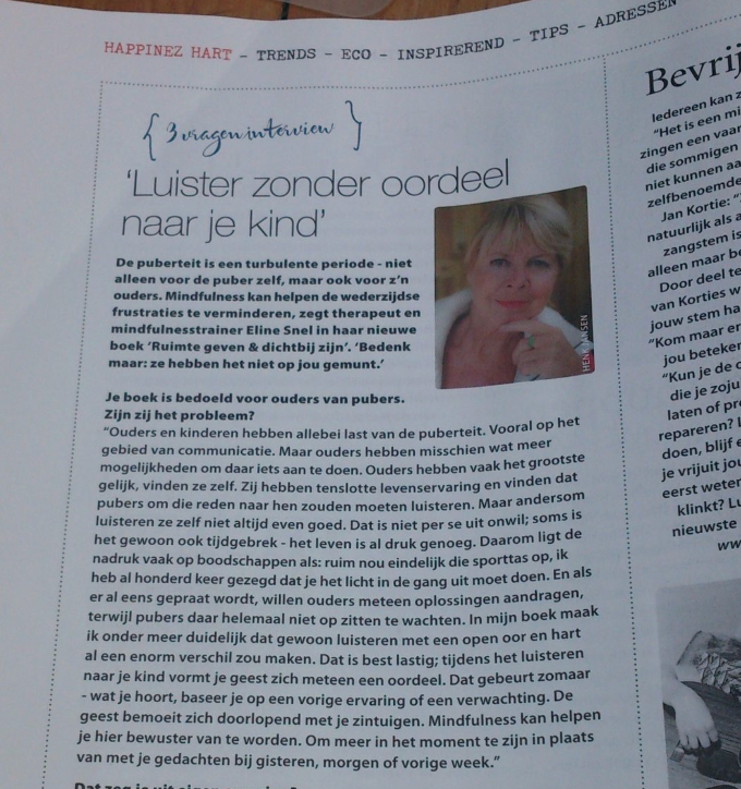 BekijkenIn Happinez verscheen een interview met Eline Snel over Ruimte Geven & Dichtbij Zijn